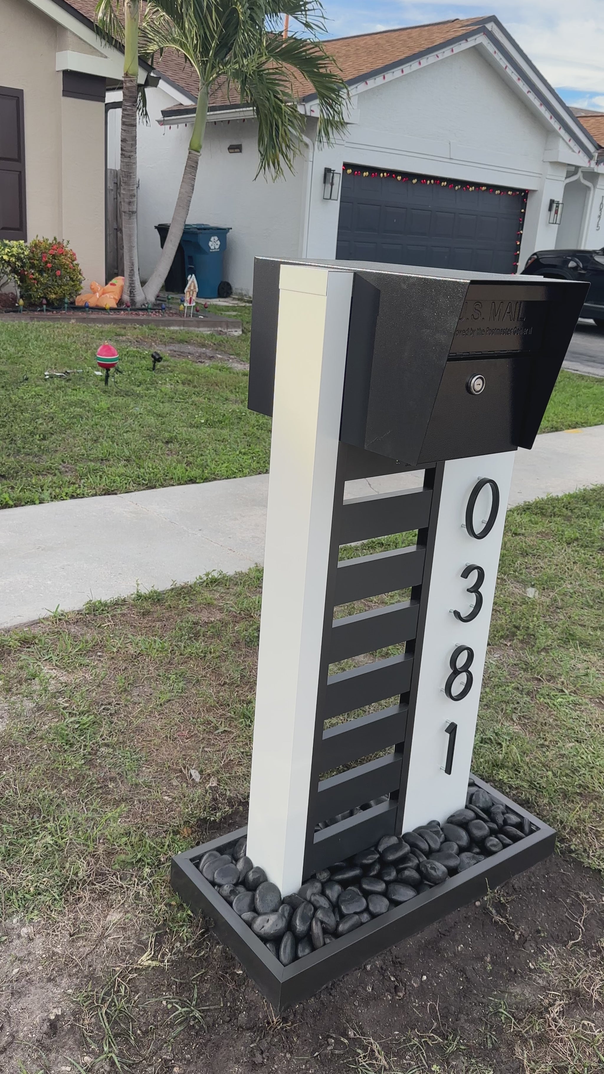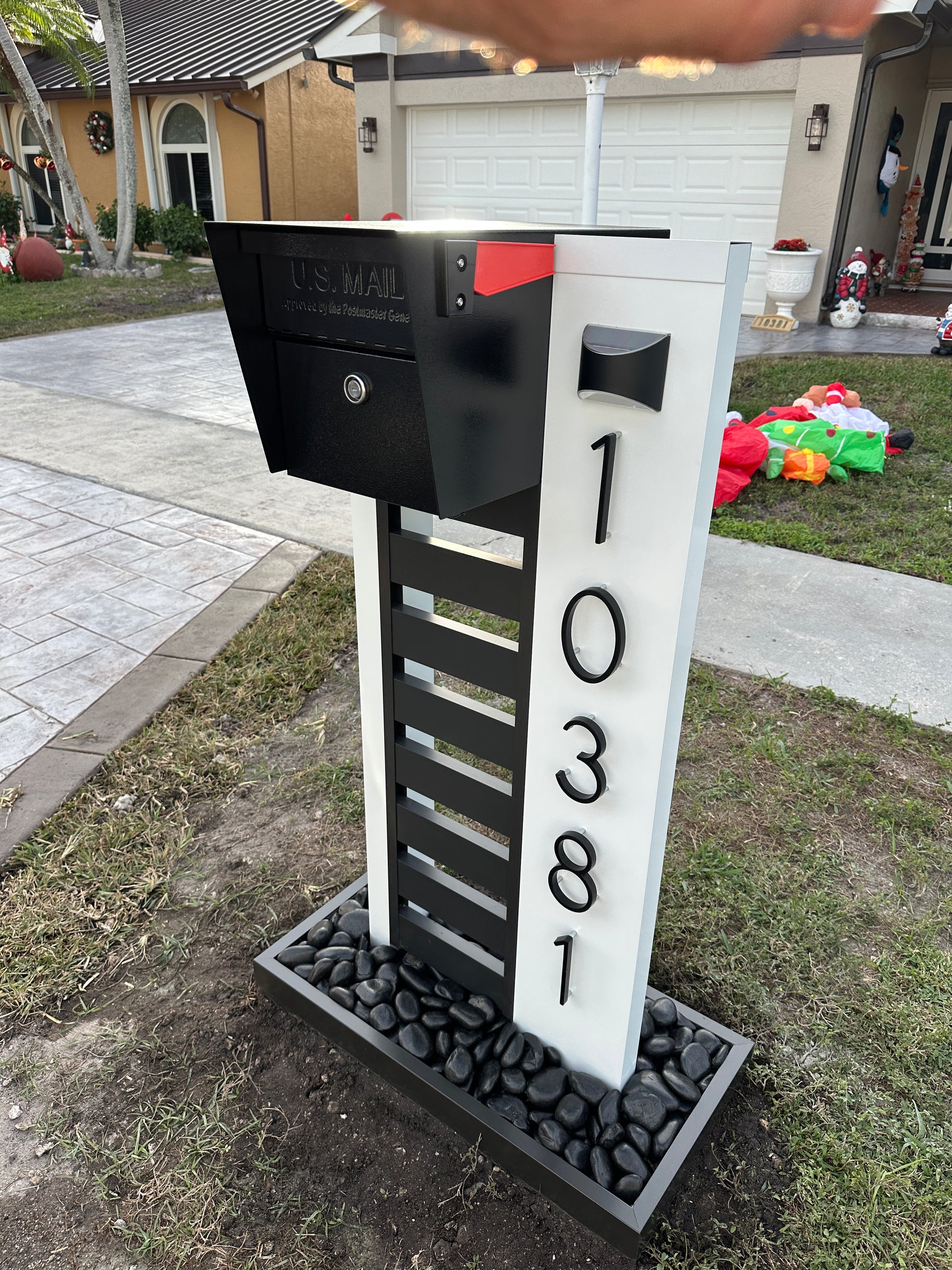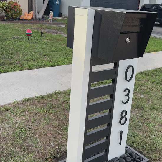 Designed for durability and modern curb appeal, this mailbox setup features a powder-coated aluminum base paired with a secure, lockable steel mailbox. It includes bold 5" house numbers for visibility and a built-in solar light to keep your address illuminated at night—combining style, function, and safety in one complete package.